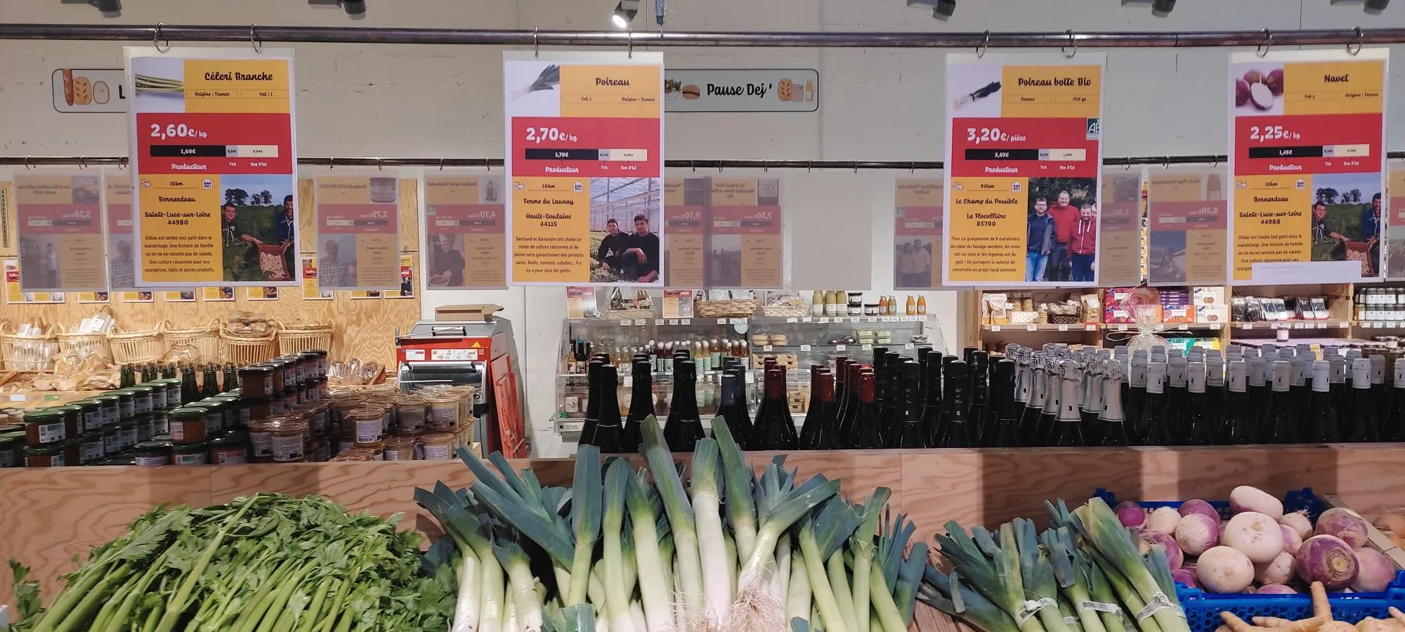 Loïc Le Moaligou vante aussi la transparence de son enseigne. Exemple avec les poireaux, à 2,70€ le kg : "il y a une petite affiche qui présente chaque produit. Ici, on voit Alexandre et Bertrand, deux maraîchers qui produisent ces poireaux. On indique que leur exploitation est située à dix kilomètres du magasin. On affiche aussi la part qui leur revient, soit 1,70€. C'est extrêmement important d'être transparent."