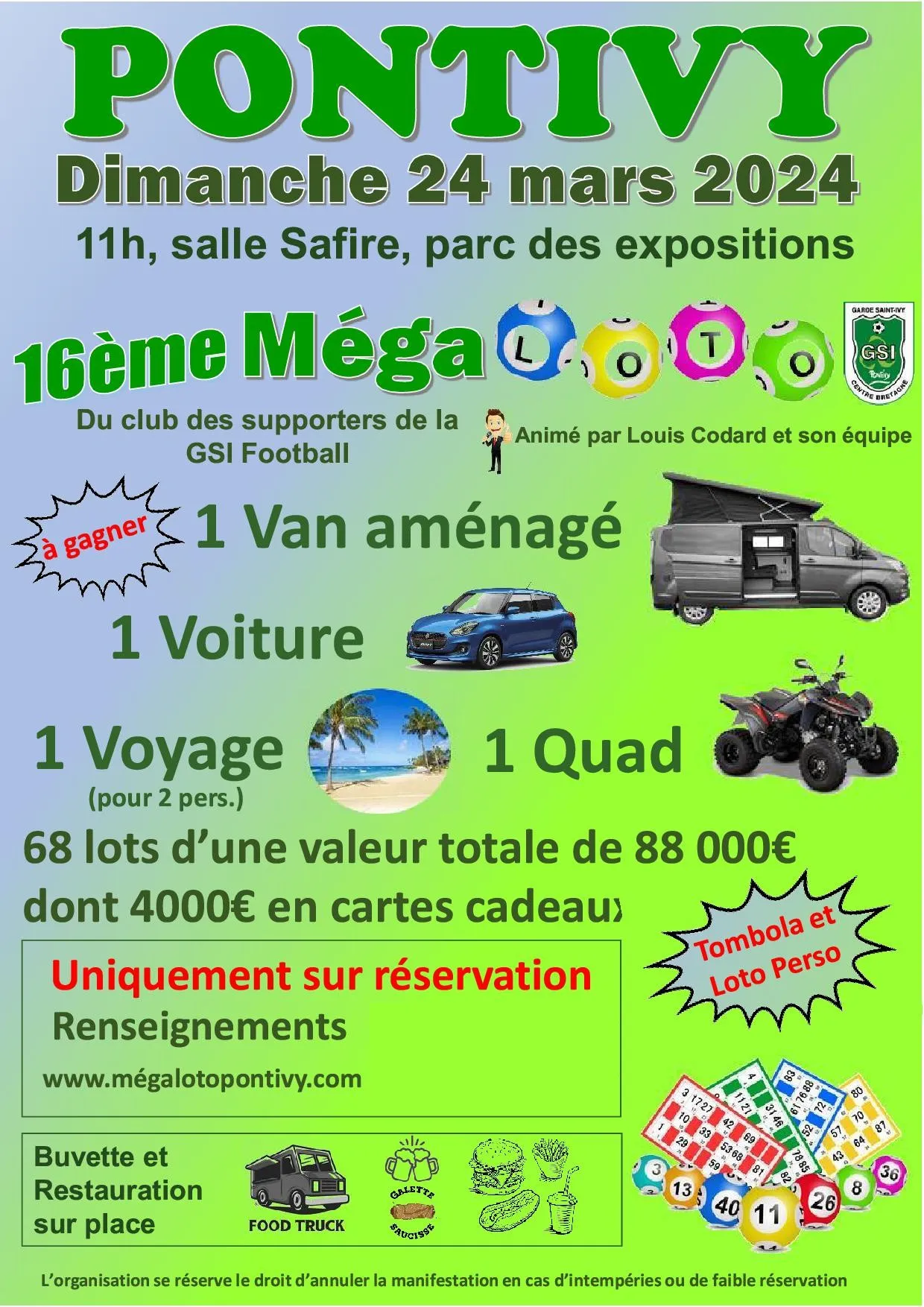 Le plus grand loto de France, organisé par le club de foot de la GSI Pontivy, se déroule ce dimanche (24 mars) à Pontivy, dans le Morbihan. Quelque 3 000 personnes sont attendues à ce méga loto qui permet aux participants de gagner une voiture, un van aménagé ou encore un voyage. Il y a des concurrents qui viennent d'assez loin, voire de très loin ... des départements limitrophes jusqu'à la Belgique.