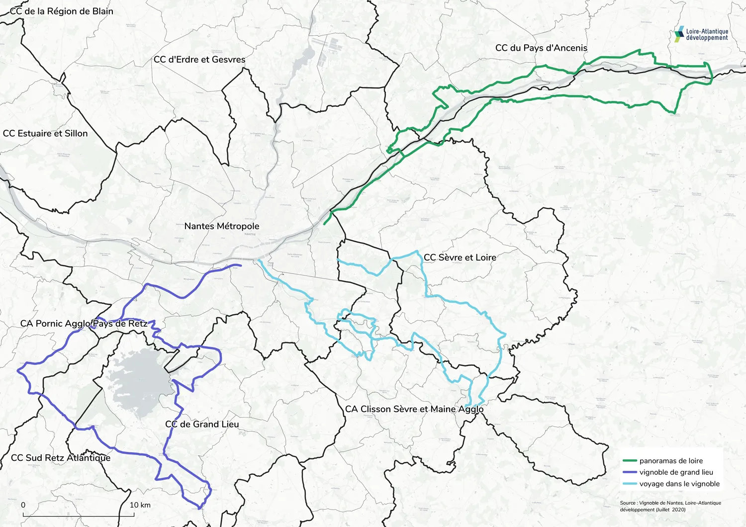 "Ces 3 routes des vins représentent le 3 AOC Muscadet, l’AOC Coteaux de la Loire, l’AOC Côtes de Grand-lieu et l’AOC Sèvre-et-Maine. Et à chaque fois ils ont une thématique, par exemple L’AOC Sèvre-et-Maine c’est le Voyage dans le Vignoble, c’est plus un parcours culture. On a ici, l’AOC Côtes de Grand-Lieu avec Vignoble de Grand-Lieu et là c’est plus l’aspect autour de lac de Grand-Lieu, avec des points de vue sur le lac. Et l’autre itinéraire Panoramas de Loire, c’est comme son nom l’indique pour découvrir les points de vue autour de la Loire et son histoire."