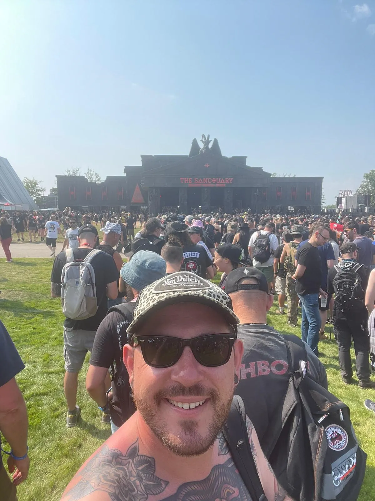 Robin que vous connaissez bien sur Hit West pour animer la matinale est déjà sur place : "c'est juste magnifique, c'est la première installation au camping, et il fait encore très chaud. On est loin de la canicule de l'année dernière avec les 40 degrés, mais on est quand même à 29° et il n'y a pas d'ombre mais l'ambiance est déjà très bonne et tout le monde est bien installé... Il y a déjà le Off, le festival qui est organisé le mardi et le mercredi, c'est exceptionnel... Bref, que des bons moments à venir et puis j'ai fait le tour des stands et il y a des nouveautés. On n'est pas encore rentré sur le site même du Hellfest où il va y avoir The Sanctuary, une nouveauté où on peut acheter plein de vêtements, mais pour le reste le Metal Corner est dingue. On peut acheter plein de trucs, et puis (côté boissons) il y a toujours le stand Ricard... Il parait qu'il y a un stand Jus de fruits, mais je n'ai pas forcément l'intention d'y faire un tour (*)!"