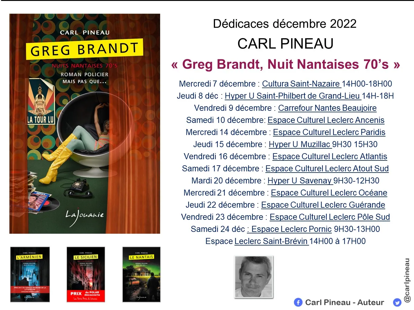 Carl Pineau est en dédicaces partout dans l’Ouest, il est à Muzillac dans le Morbihan ce jeudi 15 décembre et à Rezé près de Nantes, samedi 17 décembre. Des dédicaces sont aussi prévues ce mois-ci à Savenay, Guérande ou Pornic.