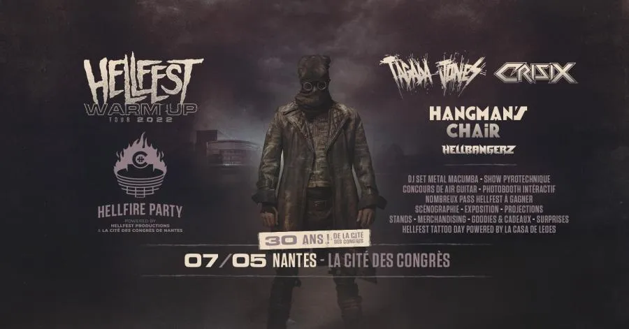 La Cité des Congrès de Nantes fête ses 30 ans avec une soirée exceptionnelle ce samedi 7 mai 2022. La Cité retransmettra la finale de la Coupe de France de Football, entre le FC Nantes et l'OGC Nice, et s’en suivra une soirée métal, avec le concert du Hellfest Warm Up tour 2022 (beyond the road) dans la grande halle, avec les groupes Tagada Jones, Crisix, Hangman's Chair et Hellbangerz. Concours aussi de Air Guitar et tatoueurs sur place.