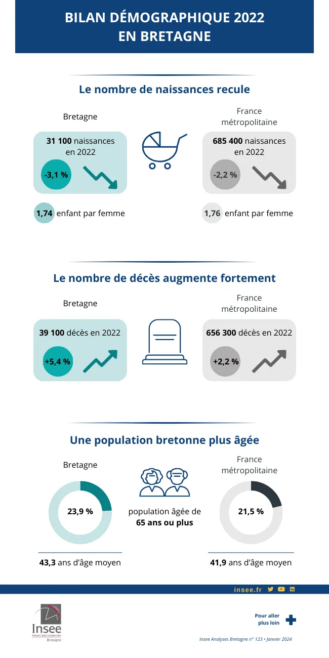 supérieure à l'évolution nationale (+0,3 %). En 2022, le solde naturel (différence entre le nombre de naissances et le nombre de décès) continue de se dégrader en Bretagne. Il atteint un déficit record de 8 000 personnes contre 5 000 en 2021. Dans la région, les décès sont globalement supérieurs aux