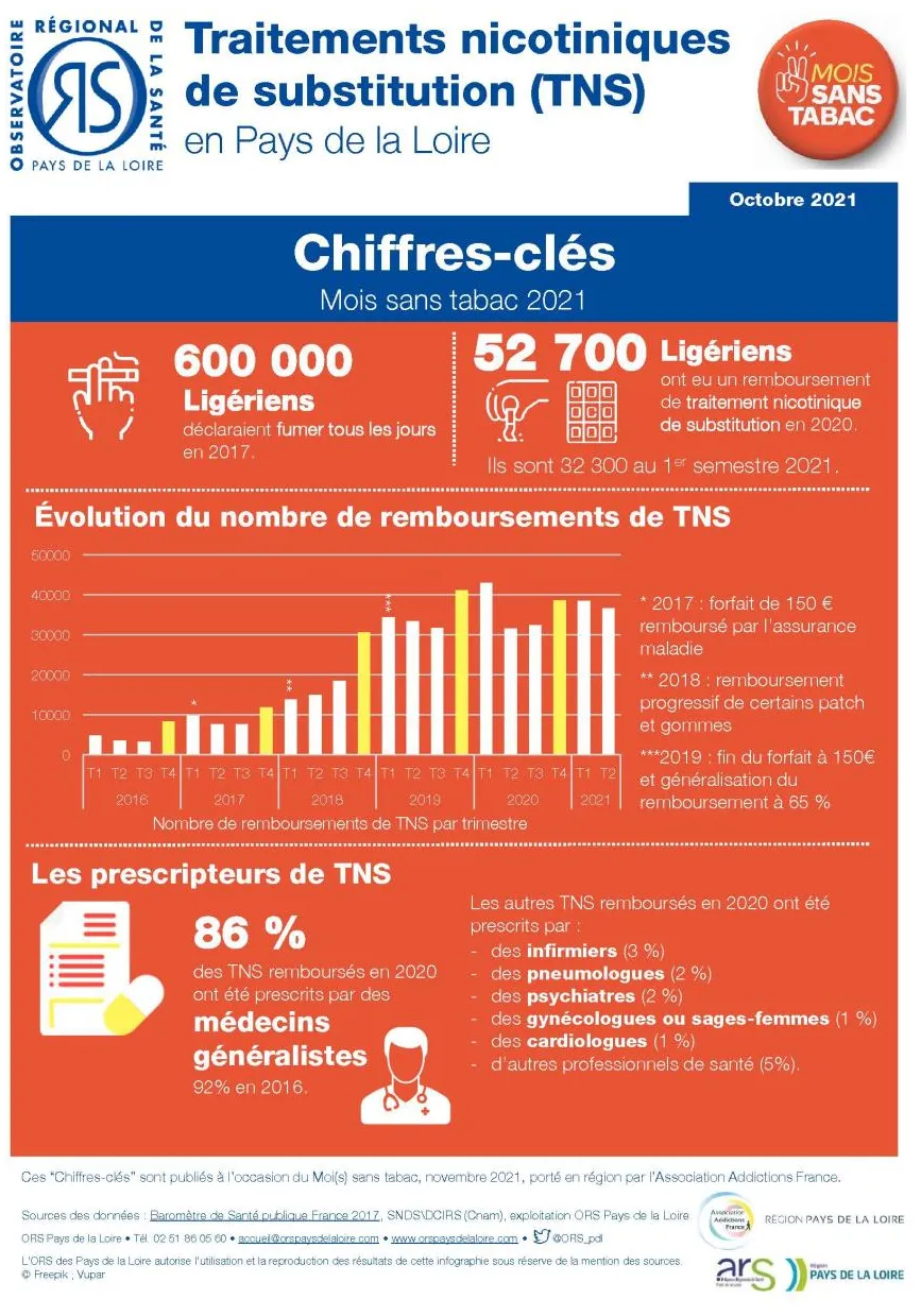 La 6ème édition de l’opération a été lancée hier (1er novembre) par Santé publique France, en partenariat avec le Ministère des Solidarités et de la Santé et l’Assurance Maladie. Pour les fumeurs, c’est l’occasion d’arrêter car un accompagnement au sevrage est prévu. Le tabac reste aujourd’hui la première cause évitable de mortalité en France... Quelques chiffres : alors que le tabagisme était en baisse en France métropolitaine avec 1,9 million de fumeurs quotidiens entre 2014 et 2019, le dernier Baromètre de Santé publique France du mois de mai (2021) note une stabilisation. 600 000 Ligériens déclaraient fumer tous les jours en 2017, et 52 700 ont eu un remboursement de traitement nicotinique de substitution en 2020, ils sont 32 300 au 1er trimestre 2021. Notez que 86% des traitements remboursés en 2020 ont été prescrits par des médecins généralistes contre 92% en 2016.